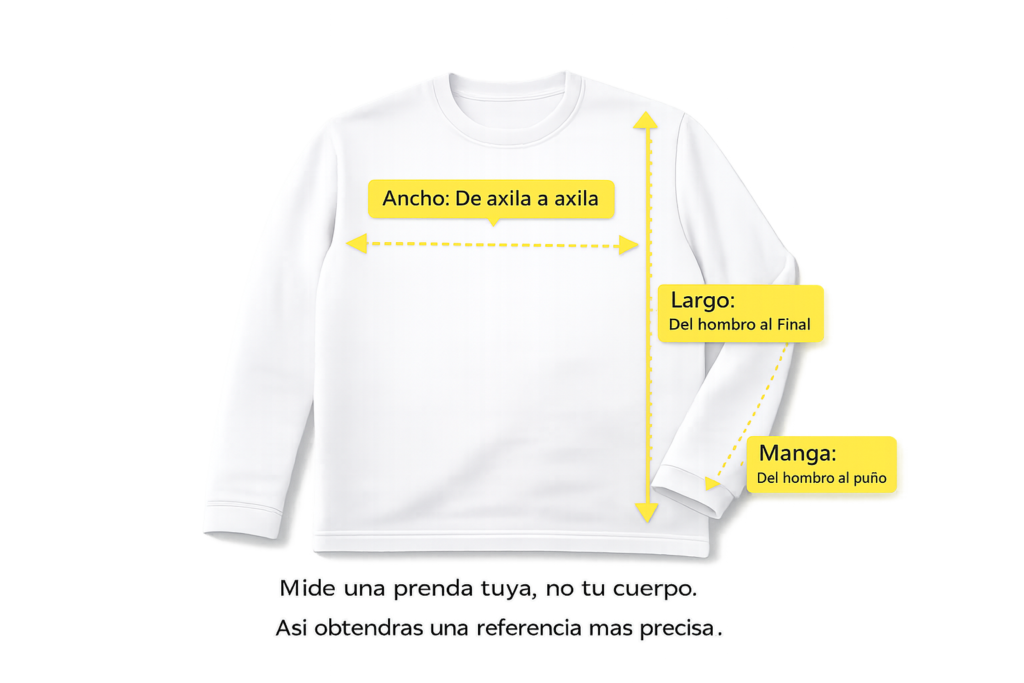 Consulta las medidas de referencia por tipo de prenda antes de realizar tu pedido. Si buscas un ajuste más holgado, considera una talla arriba.