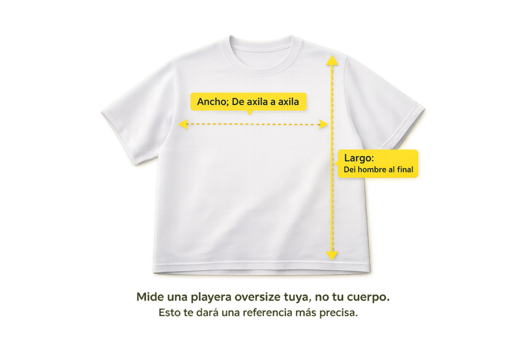 Estas medidas son de referencia y pueden presentar ligeras variaciones de confección. Este modelo está diseñado para ofrecer una silueta amplia desde su base. Si prefieres una apariencia menos holgada, te recomendamos revisar especialmente la medida de ancho antes de elegir tu talla. Si dudas entre dos tallas, ambas conservarán la intención oversize, variando en amplitud y largo total.